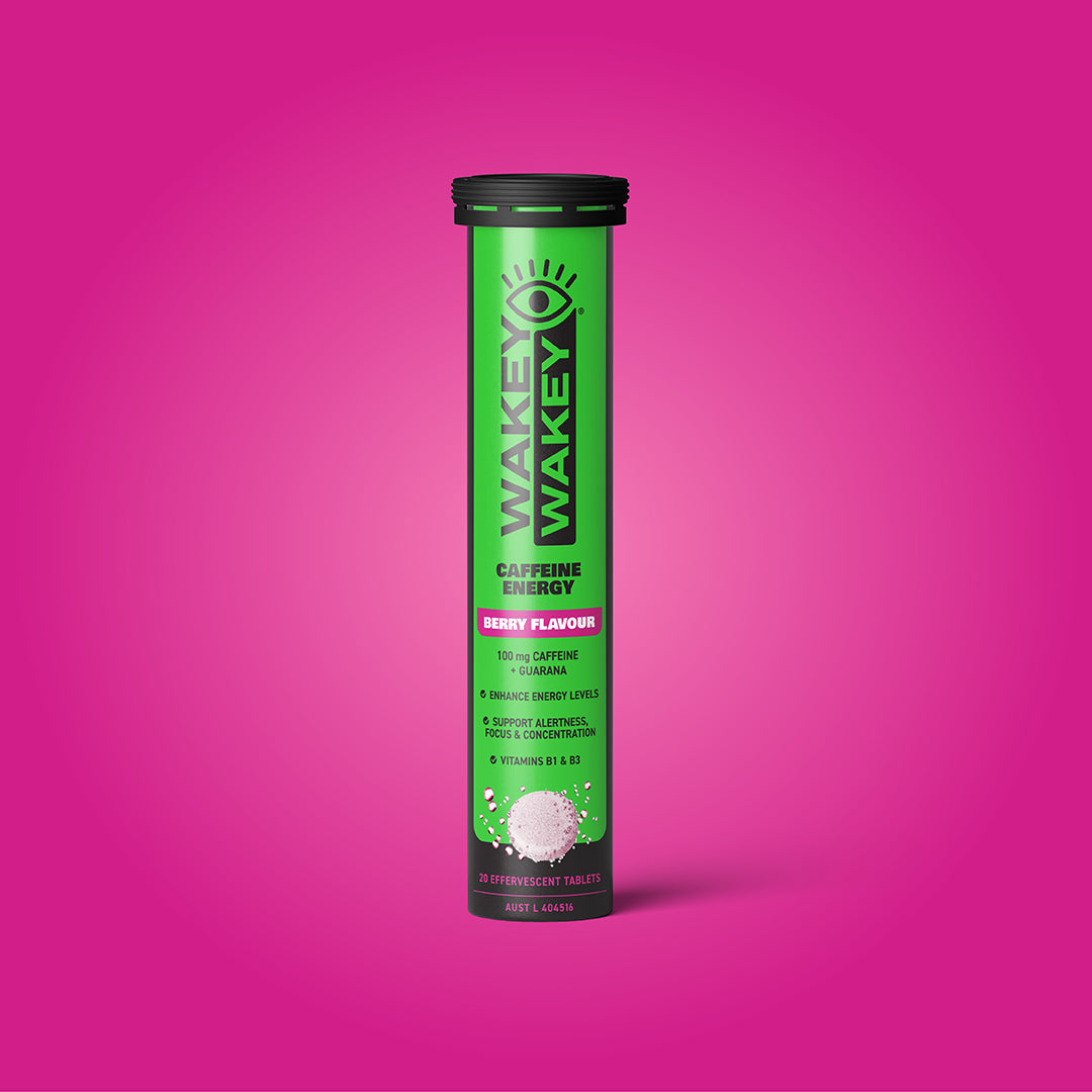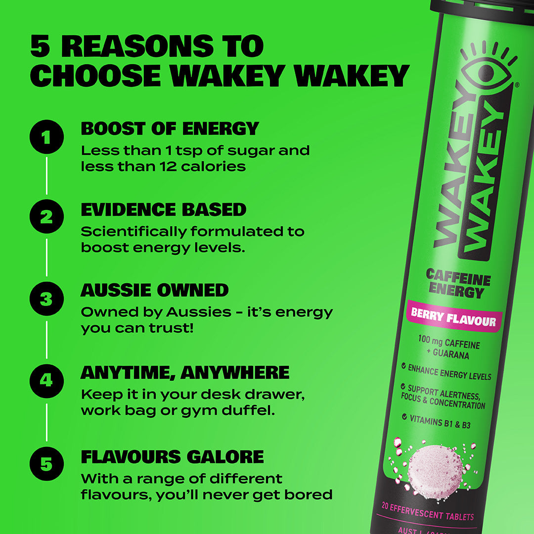 When life needs a little more oomph, grab a Wakey Wakey Berry Effervescent! Packed with 100 mg of caffeine & guarana, with B vitamins and less than 1 g of sugar per serve.